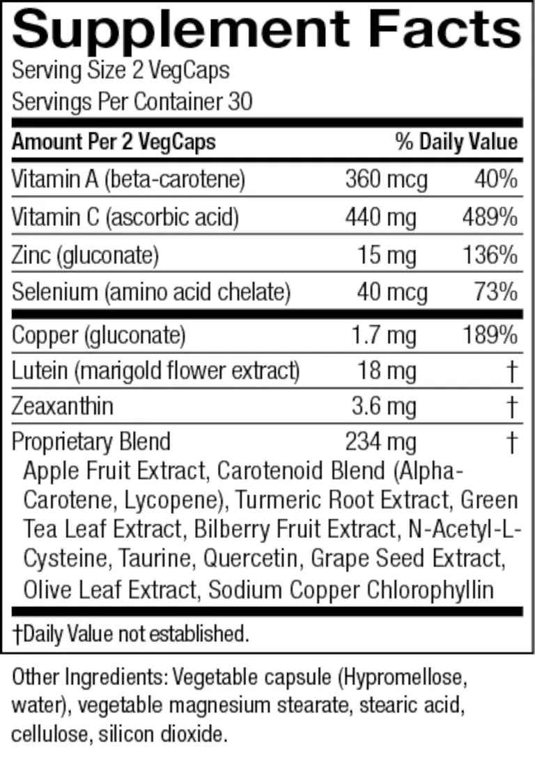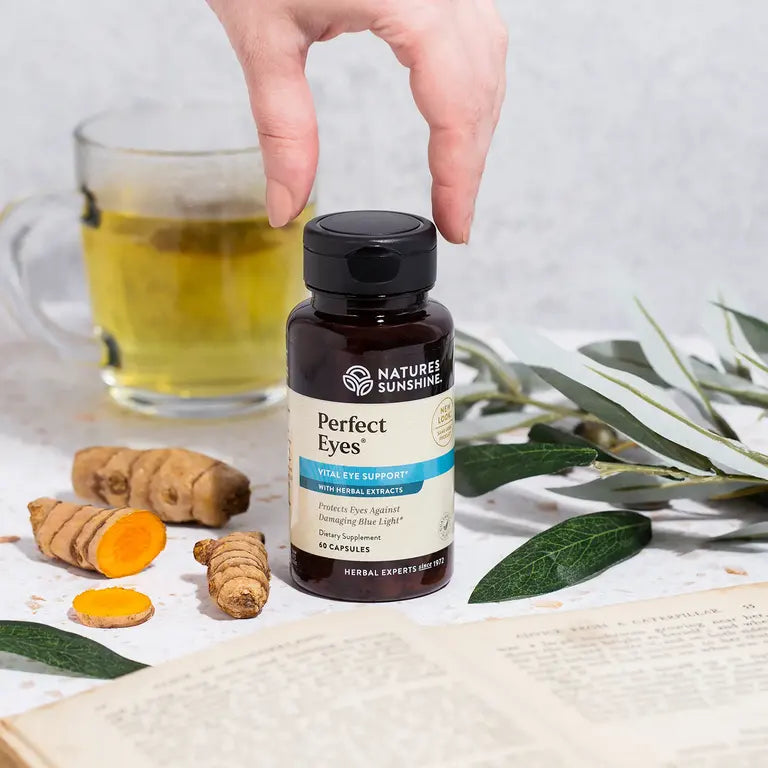 Nuestros ojos exponerse constantemente a la luz solar y la luz artificial, lo que puede producir radicales libres que pueden dañar las células oculares. Con la edad nuestra producción natural de antioxidantes disminuye y los pigmentos de nuestros ojos pueden cambiar. La luteína y la zeaxantina son dos ingredientes clave en esta fórmula que pueden reducir el riesgo de daño oxidativo inducido por la luz que podría conducir a la degeneración macular relacionada con la edad. Estos dos nutrientes benefician la salud ocular al impedir que la luz azul llegue a las estructuras subyacentes en la retina. Perfect Eyes® incluye vitamina A (betacaroteno), vitamina C, zinc, selenio, cobre, luteína y zeaxantina, ingredientes inspirados en el estudio AREDS (estudio de enfermedades oculares relacionadas con la edad) que respalda la salud ocular y mantiene una vision saludable.